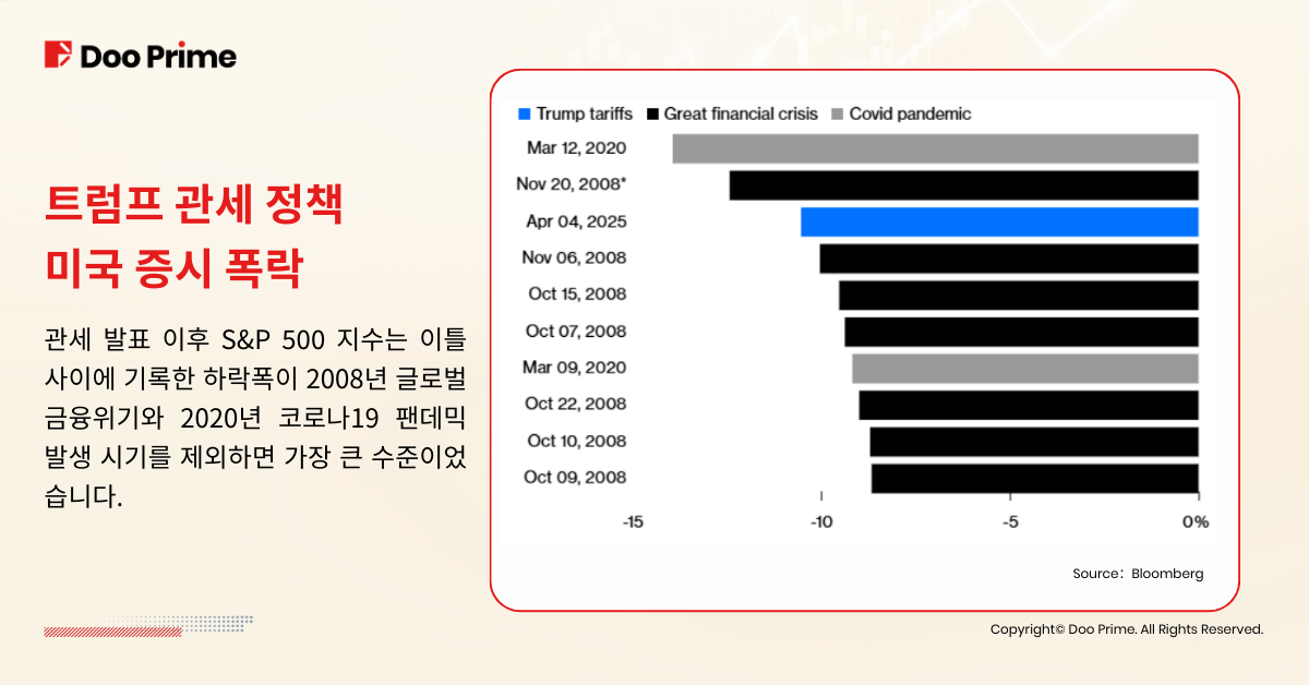4월 4일, S&P 500 지수는 다시 한 번 5.97% 급락하며, 2020년 3월 이후 가장 큰 일일 하락률을 기록했습니다.