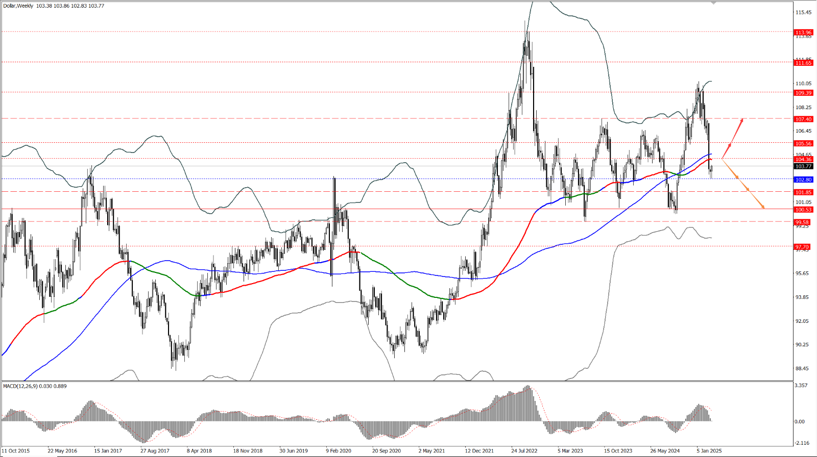 - 上周,美指在 102.80 一线附近企稳回弹,但单从上周所收阳线来看,整体空方势能为主的局面并未被实质性改变,因此,本周依旧关注周多空分届 104.36 一线;
