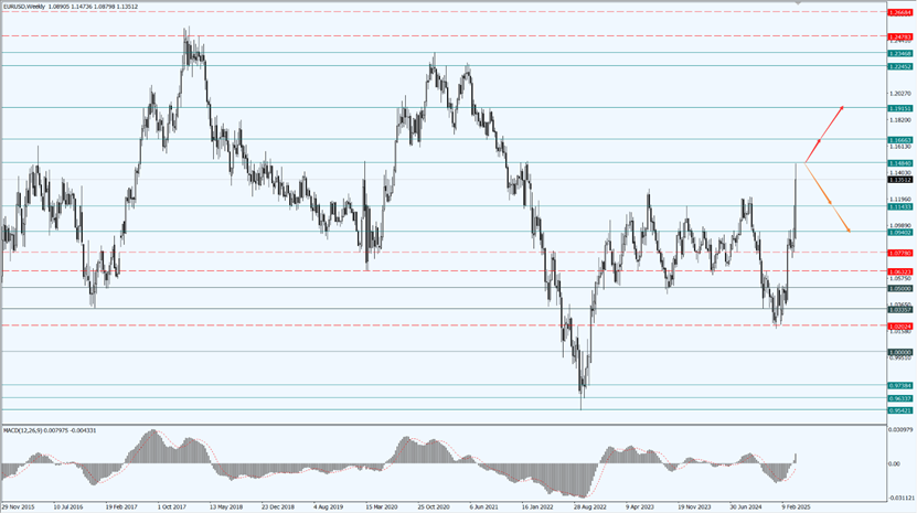 • 上周欧元兑美元按照预期站上关键位置 1.0940 一线后大幅拉升,一举冲至关键压力位 1.1484 一线,本周关注周多空分届 1.1484 一线;
