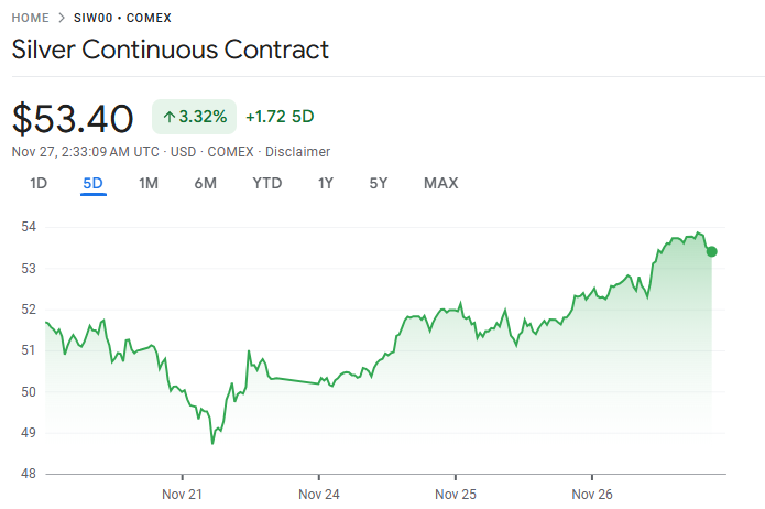 11 月 26 日至 27 日,白银(XAG/USD)周三大幅上涨,盘中交易价格约为每盎司 52.45 美元,日内涨幅达 2%。受美国国债收益率持续走低及投资者转向无利息资产的推动,白银延续近期上行趋势,市场看涨情绪明显升温。