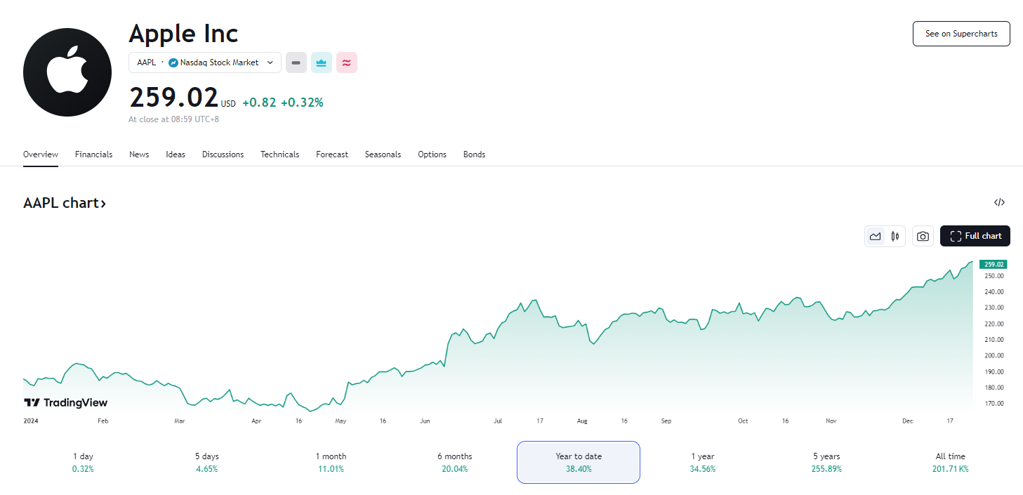 26 日,苹果股价早盘触及 260 美元,创下盘中新高,随后小幅回吐涨幅,最终收涨 0.3%,报 259 美元,创下了收盘纪录,为连续第四日创新高,市值达 3.92 万亿美元。