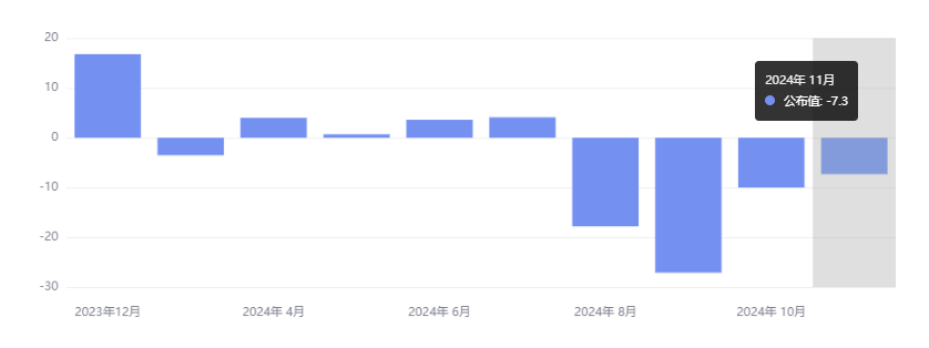 27 日,中国国家统计局公布,11 月份规模以上工业企业利润同比下降 7.3%,在去年高基数基础上降幅较 10 月份大幅收窄 2.7 个百分点。1—11 月份全国规模以上工业企业实现利润总额 66674.8 亿元,同比下降 4.7%,高于前值的 4.3%。