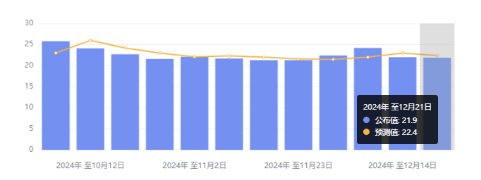 26 日,美国劳工部公布,截至 12 月 21 日当周的首次申请失业救济人数为 21.9 万人,低于预期的 22.4万人,也低于前值的 22 万人,降至一个月以来的最低水平,显示出美国就业市场保持稳定。