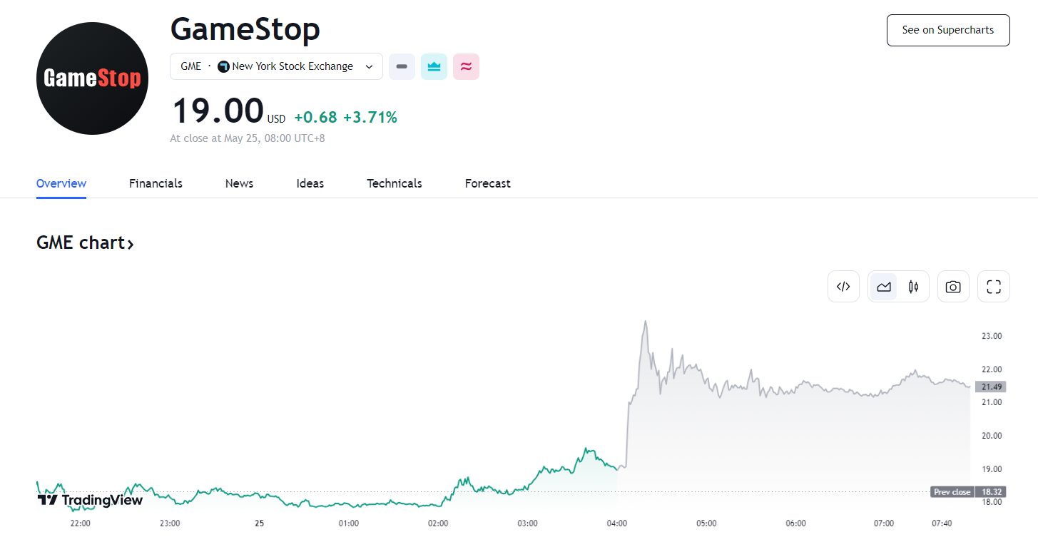 24 日美股盘后,游戏驿站(GameStop)完成增发募资逾 9 亿美元,其股价盘后一度大涨 22%,此后涨幅有所收窄,AMC 也随之拉涨。
