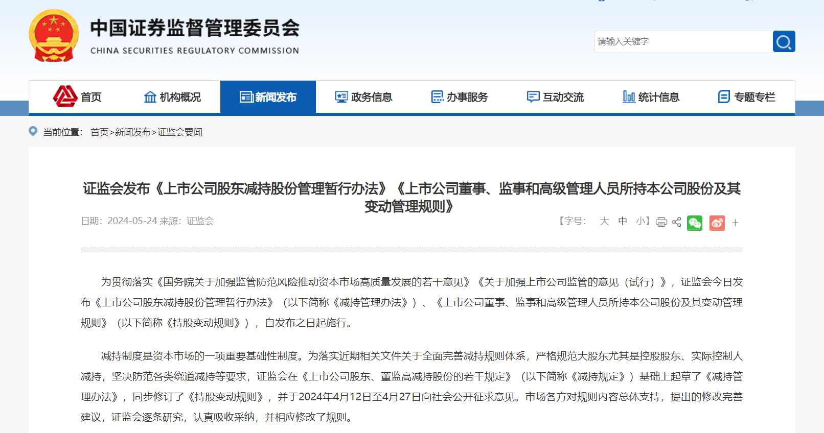 5 月 24 晚,中国证监会发布《上市公司股东减持股份管理暂行办法》《上市公司董事、监事和高级管理人员所持本公司股份及其变动管理规则》。