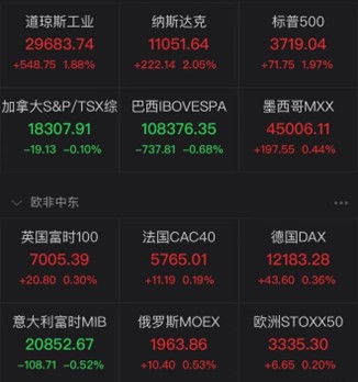 截至收盘,道琼斯指数涨 1.88%,报 29,683.74 点;标普 500 指数涨 1.97%,报 3,719.04 点;纳斯达克指数涨 2.05%,报 11,051.64 点。