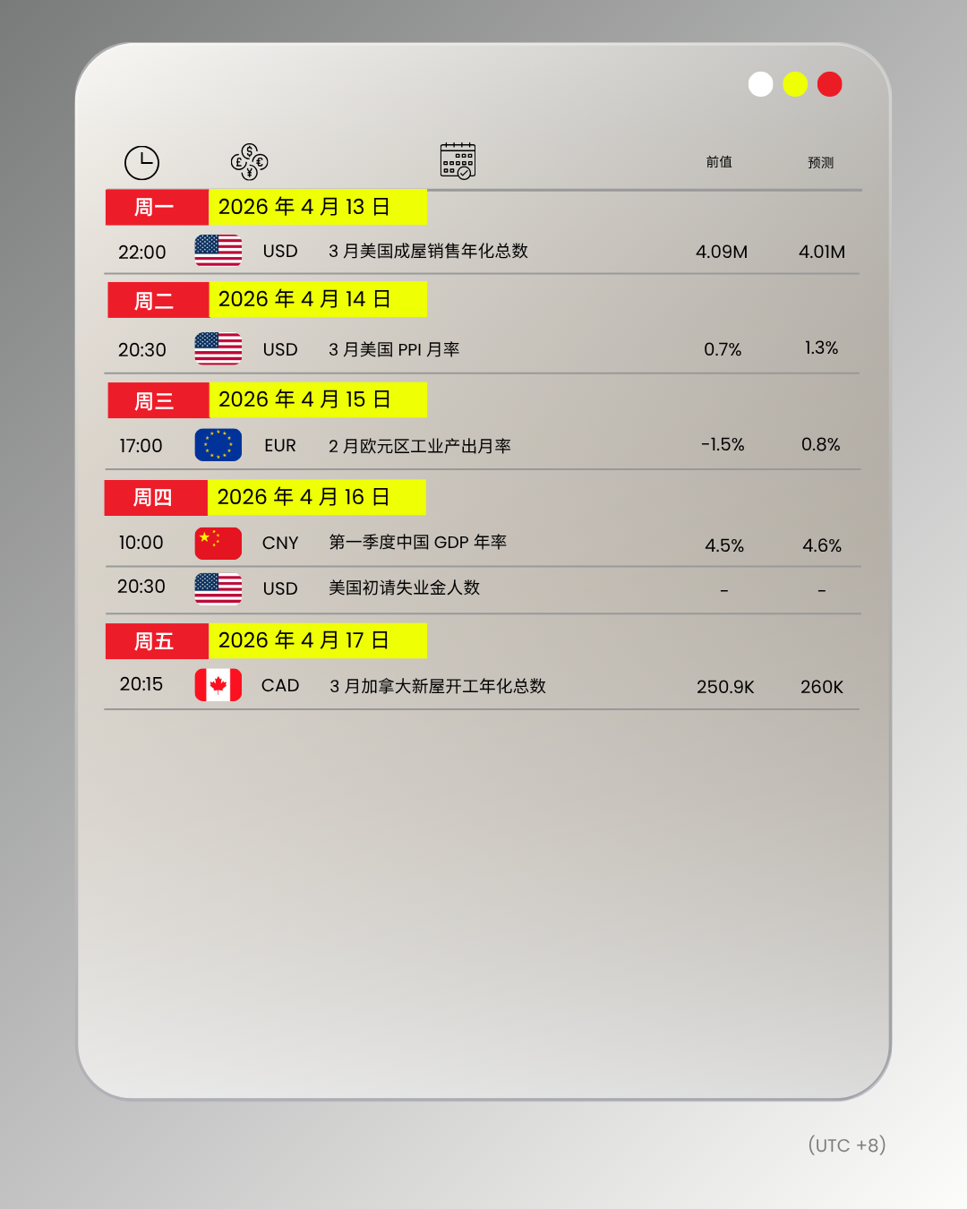 财经日历 | 以下为 2026 年 4 月 13 日至 2026 年 4 月 17 日(GMT+8 北京时间) 全球重大经济事件提醒。在重大行情期间,请确保您已审查您的保证金率,并有足够的保证金来支撑您的风险敞口。