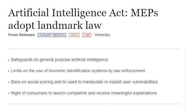 欧盟议会以 523 赞成对 46 反对的压倒性票数通过了全球首个 AI 法案,旨在确保 AI 的使用不会侵犯人的基本权利,如隐私、数据保护和非歧视等,预计将于今年 5 月生效。届时,所有的欧盟成员国都将遵守相关 AI 法案规定。
