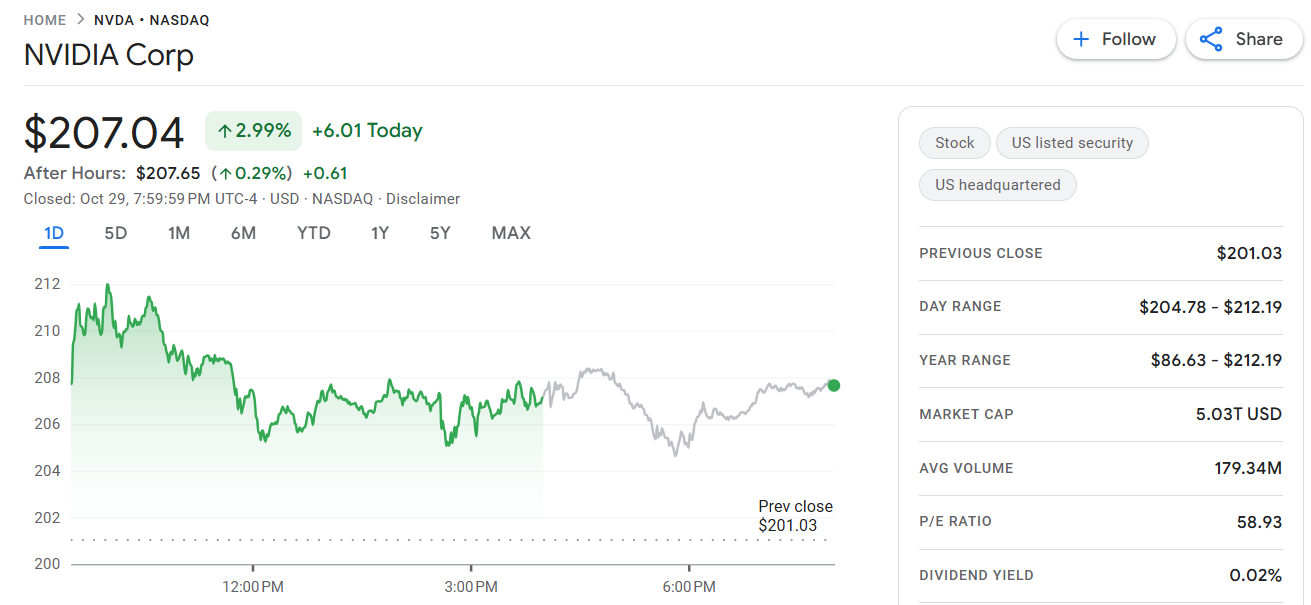 周三美股开盘后,英伟达股价一度触及 212.19 美元的历史新高,随后回落至约 206.15 美元,当日上涨约 2.5%。股价突破每股 206 美元后,英伟达市值首次升至 5 兆美元,成为全球首家达到此里程碑的公司。