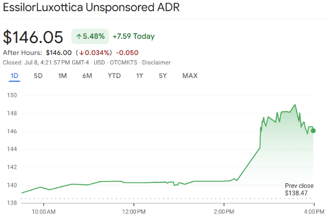 EssilorLuxottica 的美国存托凭证(ADR 代码:ESLOY-US)周二盘中最高涨幅达 6.9%,报 148 美元,为 4 月 9 日以来最大单日涨幅,最终收于 146.05 美元。Meta及EssilorLuxottica方面均对此事未作评论。