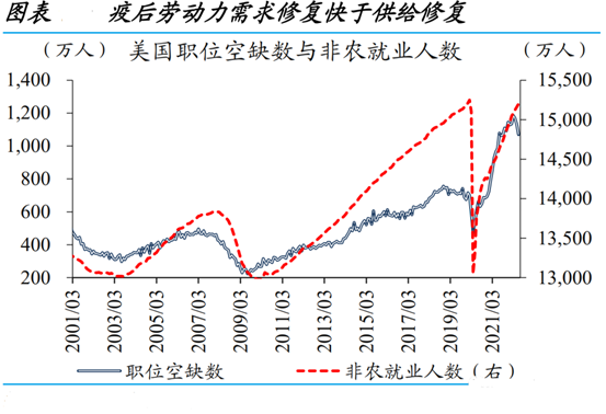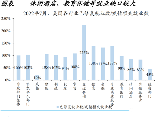 目前薪资上涨趋势未见明显缓解,平均时薪增速依然在 5.2% 的高位,而跳槽员工薪资增速已达 6.4%,明显超出美联储 2% 的通胀目标水平。目前供需缺口依然较大,7 月的平均时薪继续上升至 32.27 美元/小时。由于疫情后的就业回暖落后于产出,尽管生产放缓,在供需缺口依然较高的情况下,就业还需要一段时间的追赶。