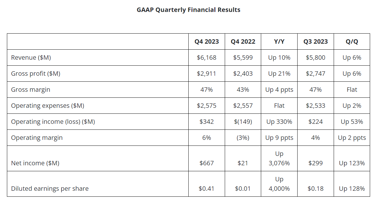 AMD 公布了 2023 年第四季度业绩。财报显示,AMD 第四季度营收 62 亿美元,同比增长 10.7%,超出市场预期;净利润 6.67 亿美元,上年同期为 2100 万美元;摊薄后每股收益为 0.41 美元,上年同期为 0.01 美元。