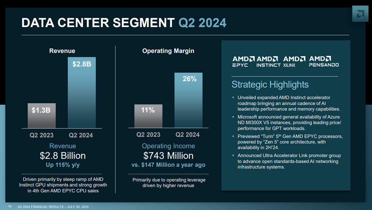 其中,数据中心业务的增长速度惊人,在一年内翻了一倍。公司 AI 芯片的出色表现极大地提振了投资者信心。AMD 的数据中心业务第二季度的净收入为 28 亿美元,同比增长了 115%,这主要得益于 AI 加速器 MI300 的强劲需求。