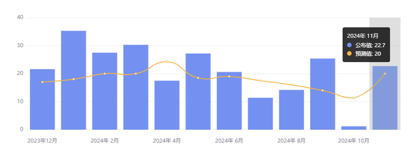 11 月 PPI 因一系列存量政策和增量政策协同发力,国内工业品需求有所恢复,环比由上月下降 0.1% 转为上涨 0.1%;同比下降 2.5%,降幅比上月收窄 0.4 个百分点。工业生产者购进价格同比下降 2.5%,环比下降 0.1%。1 月至 11 月平均工业生产者出厂价格比上年同期下降 2.1%,工业生产者购进价格下降 2.2%。