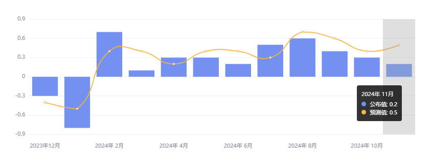 12 月 9 日,中国国家统计局公布,11 月 CPI 同比上涨 0.2%,受气温偏高及出行需求回落等因素影响,涨幅比上月回落 0.1 个百分点;环比下降 0.6%,降幅比上月扩大 0.3 个百分点;1 月至 11 月平均全国居民消费价格比上年同期上涨 0.3%。