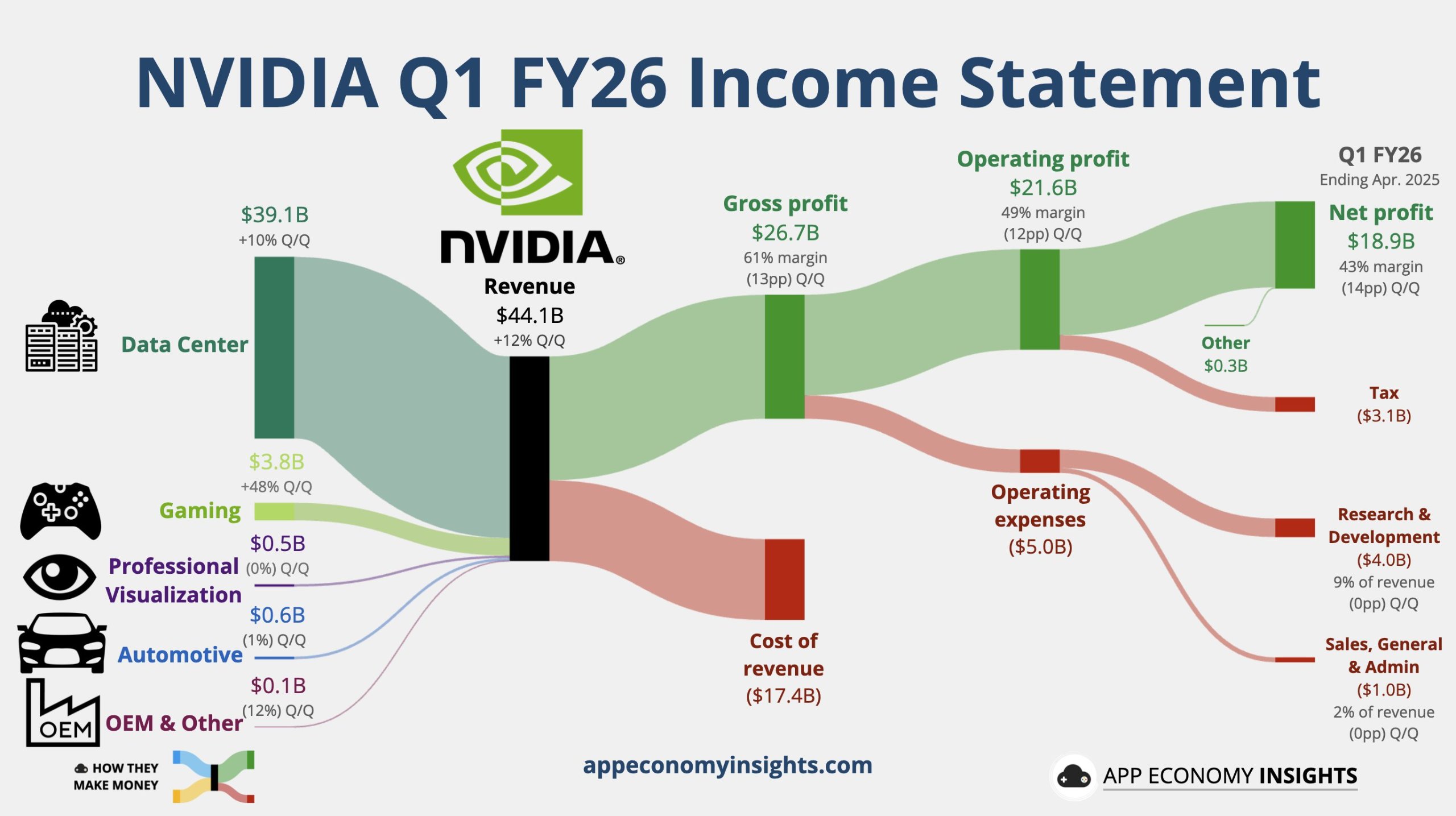 • 英伟达第一财季整体营收同比增长 69%,达到 441 亿美元,高于市场预期的 431 亿美元;