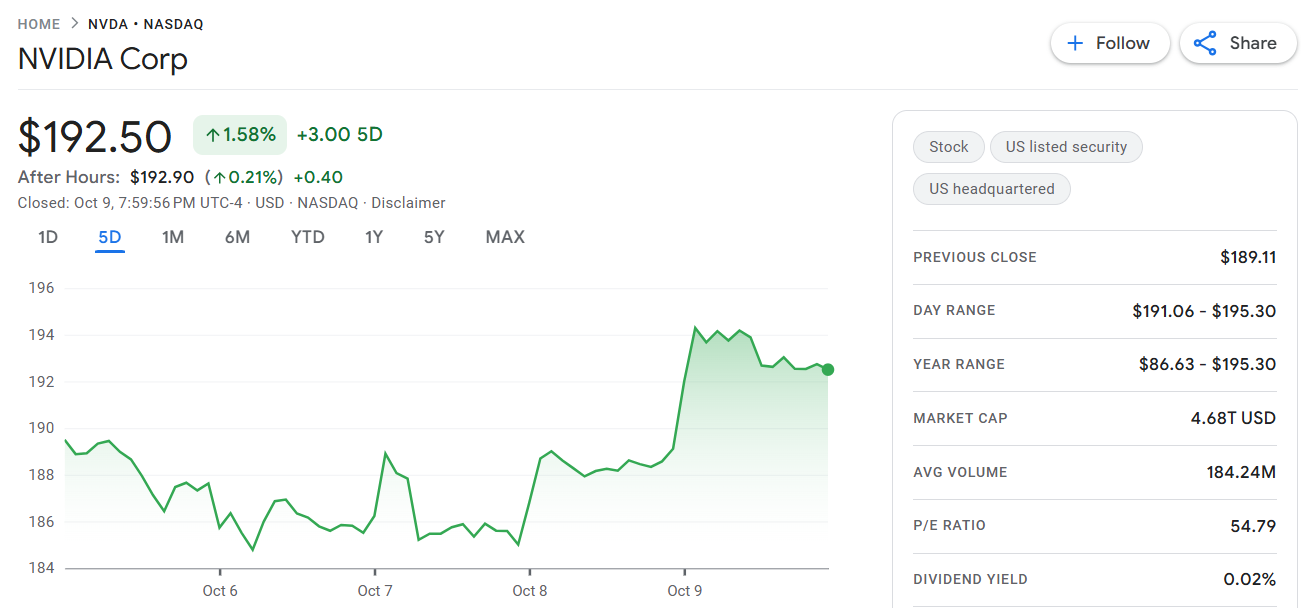 10 月 9 日至 10 日,英伟达(NVDA) 股价周四盘中与收盘均创历史新高,收报 193 美元,涨幅超 2.5%,成交额达 352.53 亿美元,市值逼近 4.7 万亿美元。