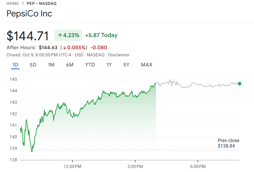 10 月 9 日至 10 日,百事公司(PEP) 公布第三季度财报,业绩超出市场预期,主要受益于 国际市场的增长弥补了北美地区销量下滑。