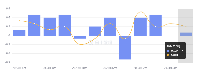 美国商务部公布的 5 月零售销售数据显示,零售销售额环比增长 0.1%,低于市场预期的 0.3%;前值则由 0% 下修至 -0.2%。