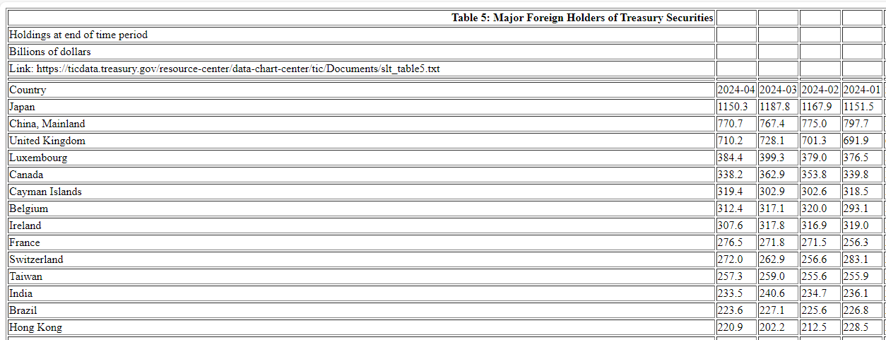 美国财政部公布的国际资本流动报告(TIC)显示,4 月日本仍是美国国债的最大海外持有国,但所持美债减少 375 亿美元至 1.15 万亿美元,创四个月最低,止步六个月连增。中国大陆仍为美债第二大海外持有地,4 月份所持美债增加 33 亿美元至 7710 亿美元,止步三个月连降,并脱离 2009 年 3 月以来的十五年最低。