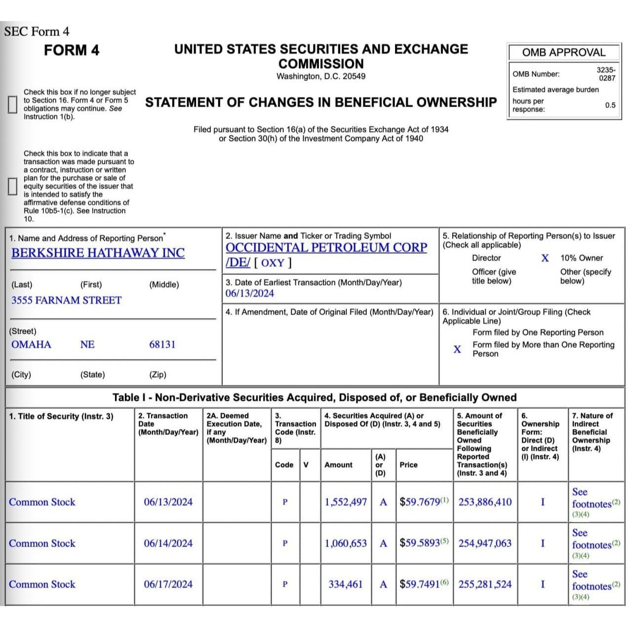 三份监管文件显示,“股神”巴菲特旗下的伯克希尔-哈撒韦公司从 6 月 5 日到 6 月 17 日的连续 9 个交易日中,都在买入西方石油的股票,总计增持了 730 万股,购买价格在每股 60 美元附近,使其持股比例接近 29%。