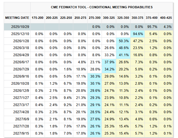 10 月 14 日至 15 日,美联储主席鲍威尔表示,目前美国经济状况与 9 月相近,暗示本月底可能再降息 25 个基点,市场对 10 月降息的预期概率接近 100%。他指出,就业市场正在降温,职位空缺减少可能推高失业率,而政府关门导致官方统计数据中断,使政策制定面临误判风险。