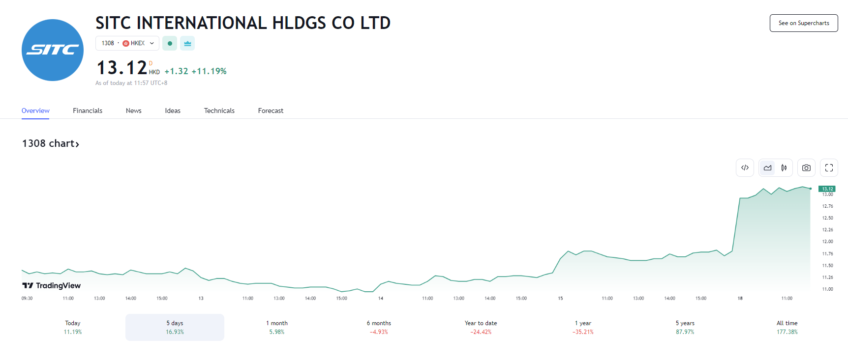 受四家航运公司宣布暂停红海运输影响,港股航运股多数上涨。截至发稿,海丰国际(01308.HK)、中远海控(01919.HK)、太平洋航运(02343.HK)、中远海能(01138.HK)分别上涨11.19%、5.99%、5.67%、4.08%。