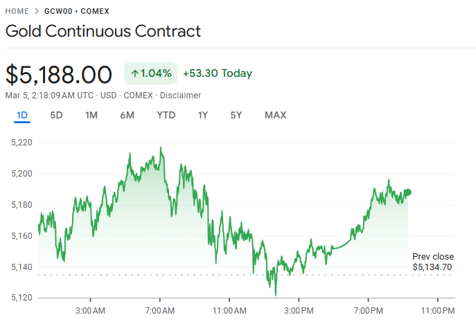 周三,国际黄金价格小幅走高,收复前一交易日部分跌幅。随着美国对伊朗的军事行动进入第 5 天,市场避险需求升温,逢低买盘入场推动金价一度上涨 2.3%,随后部分回吐涨幅。