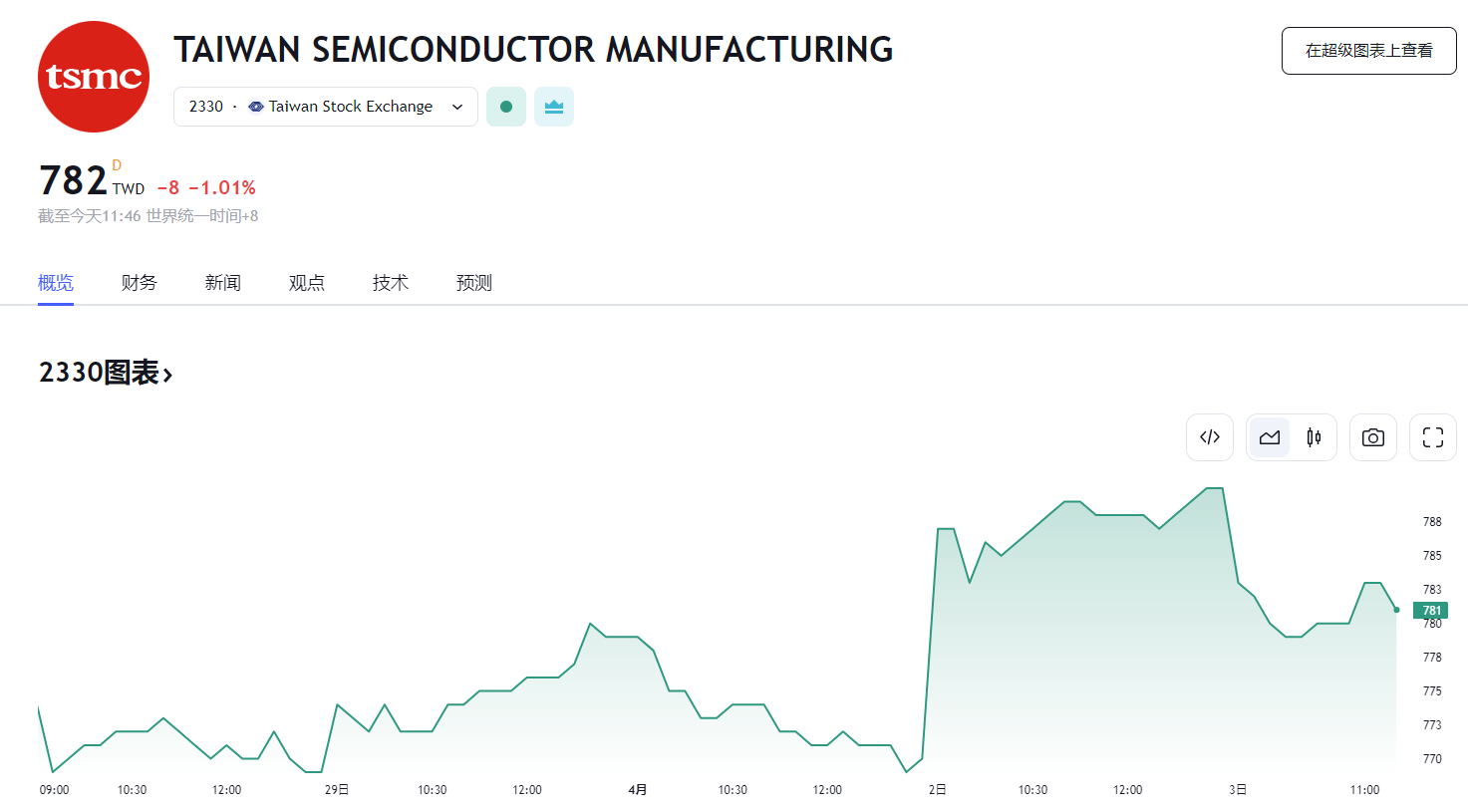 台股加权指数以 20388 点开出,跌幅扩大至 0.8%,最低下探至 20308 点。台积电开盘后也跟着下滑,从开盘价 783 元下跌 1.02%。