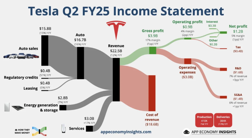 特斯拉(TSLA)发布 2025 年第二季度财报,营收同比下降 12%,降至 225.0 亿美元,创近十年来最大单季跌幅。调整后每股收益(EPS)仅为 0.4 美元,均低于市场预期。