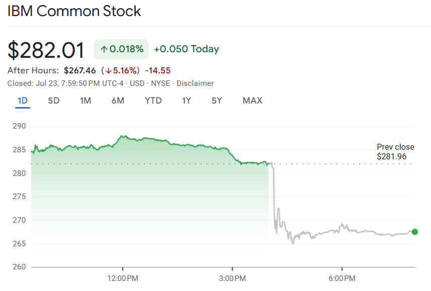 IBM 股价盘后下跌约 3.5%。不过,今年以来该股已累计上涨 28%,表现优于多数科技股。