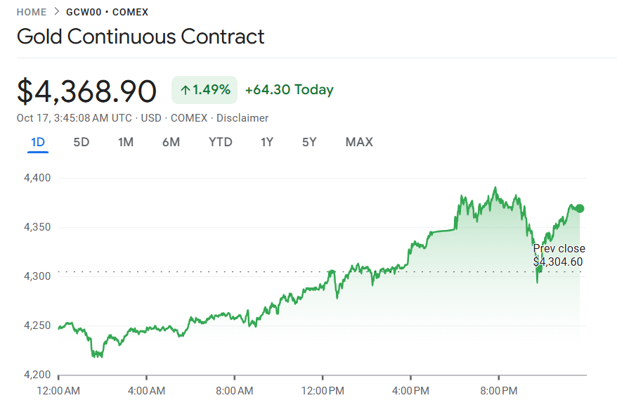 10 月 16 日至 17 日,现货黄金涨幅扩大,盘中一度逼近每盎司 4380 美元,创下历史新高。截至发稿,金价上涨 1.18%,报 4377 美元。黄金热潮推动贵金属价格在 2025 年屡创新高,延续了去年以来的强劲涨势,并超越股票市场的整体回报。