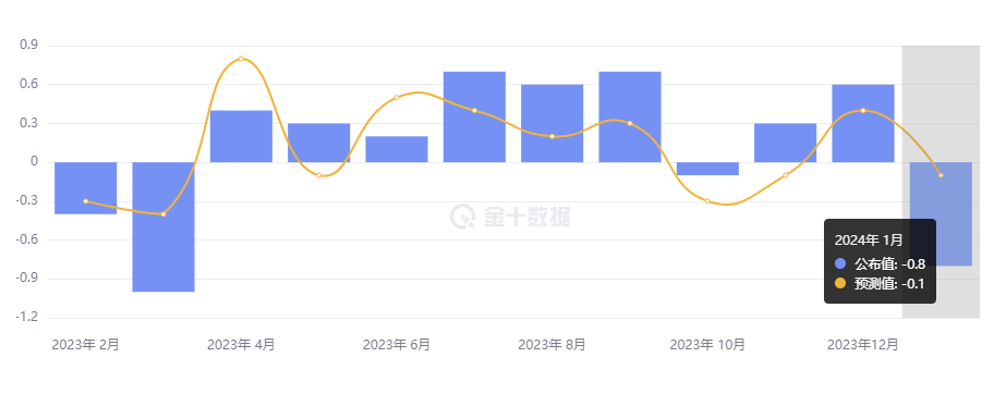 美国商务部公布 1 月零售销售数据,零售销售环比大跌 0.8%,跌幅为近一年来最大,且大幅低于预期的下跌 0.1%;12 月数据从环比上涨 0.6% 下修至 0.4%。与去年同期相比,零售销售仅增长了 0.6%。