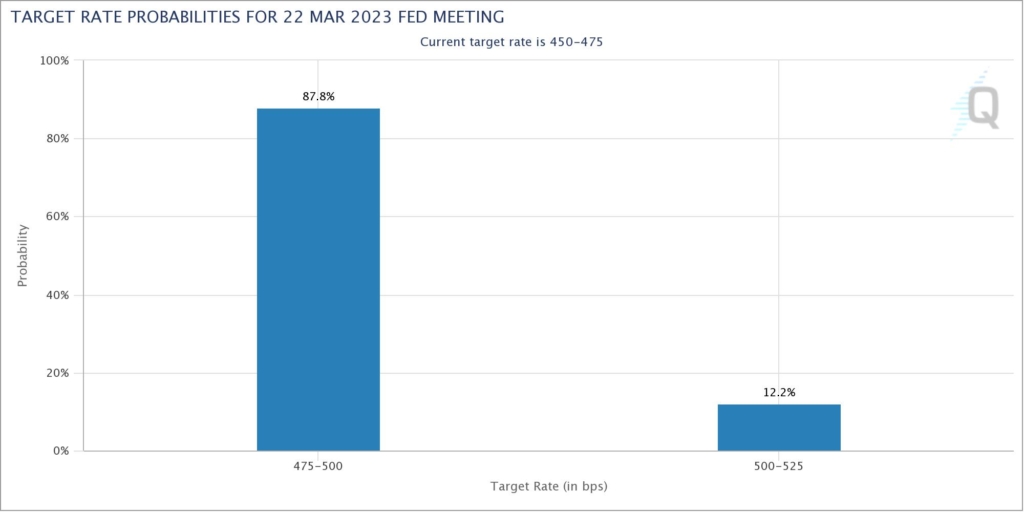 经济学家、Naroff 经济研究所的主席 Joel Naroff 表示,消费者正处于相当不错的状态,当人们对于自己的就业状态感到舒适的时候,这种情绪就能转化为消费。最新 “芝商所美联储观察工具 ( CME FedWatch Tool )” 显示,美联储 3 月加息 25 个基点的概率为 87.8%,加息 50 个基点的概率仅为 12.2%。