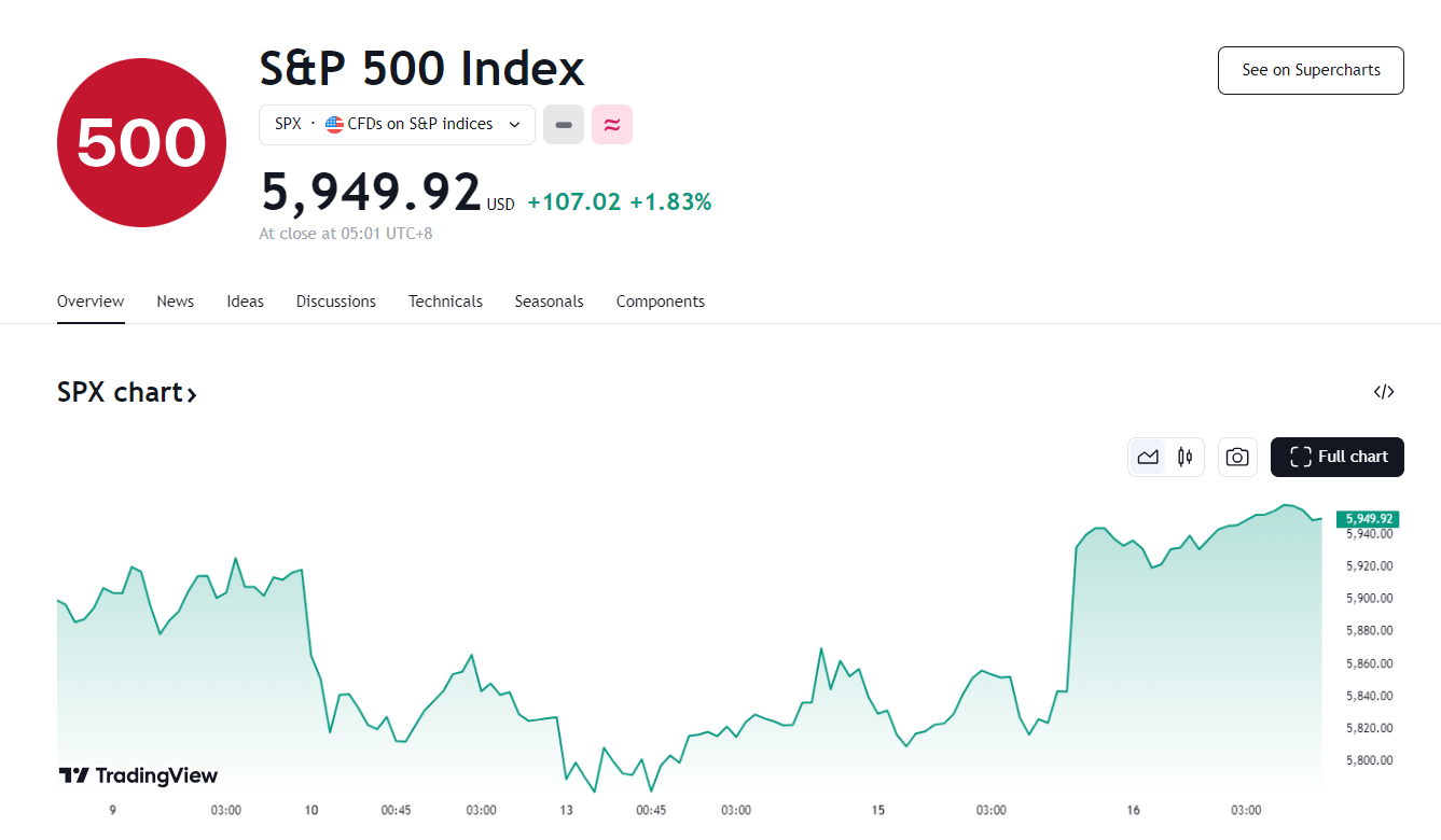 15 日,美股三大指数暴涨,纳指结束了此前连续五个交易日的下跌;道指上涨超过 700 点;标普 500 指数彻底抹去了年内的所有跌幅,同时也创下了大选次日 11 月 6 日以来的以来的最大单日涨幅。
