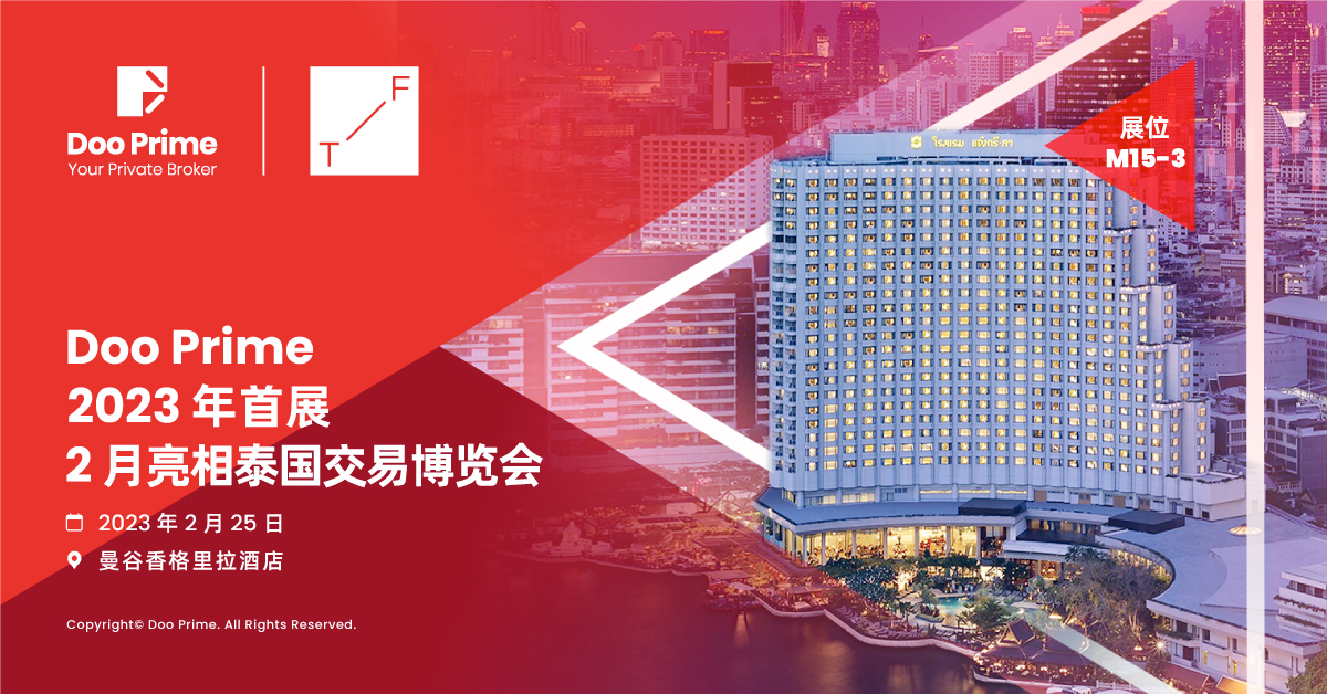 2023 年泰国交易博览会将于 2 月 25 日在曼谷香格里拉酒店拉开序幕。展会将汇聚全球上千名的投资者与业内顶尖专业人士,Doo Prime 也将在比往年更具气势的大型展位 M15-3 和与会者面对面交流,展示 Doo Prime 全面的金融产品服务和前沿的金融科技。