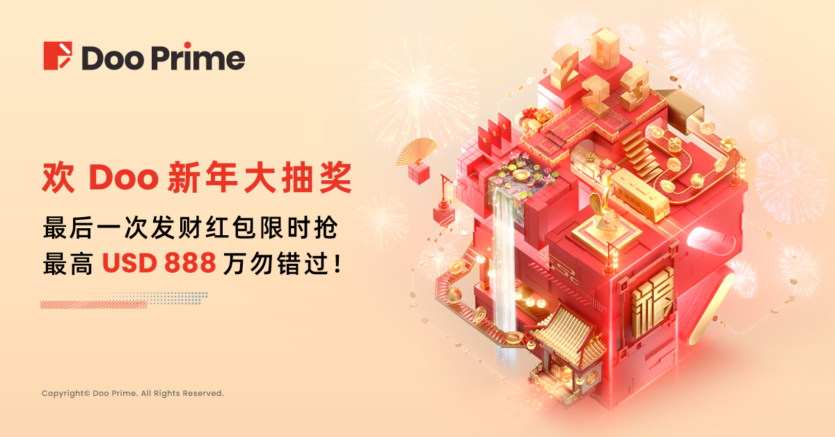 新春伊始,Doo Prime 已经为全球客户预备了海量福利,其中包括深受广大客户欢迎和支持的 “欢 Doo 新年全球大抽奖” 活动。 在新春佳节的尾声,我们将继续派发最后一波 “发财红包限时抢” 活动。希望趁着春节结束之前,把更多奖金福利送给您!也祝全球投资者 “万事如意过好年,玉兔迎春旺全年”。