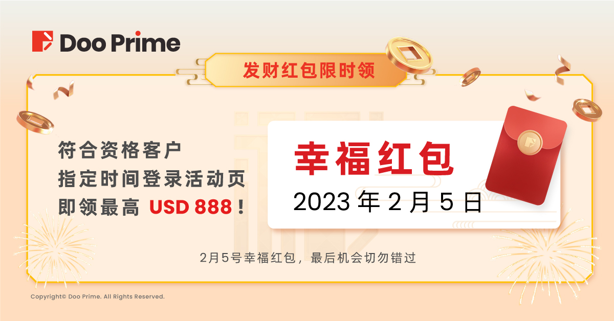 只要您曾在 Doo Prime 入金 USD 100 + 交易 1 手,即可领取限时发财红包,单次最高可领取 USD 888 !最后一次发财红包大派送,赶快来领取!
