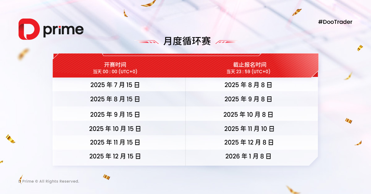 2025 年 D Prime #DooTrader 慈善交易杯将隆重升级为长达 6 个月的高端交易盛事,每轮月度循环赛均为期一个月,每轮从破浪组中角逐出 5 名优胜者,最终,30 名优胜选手将获得前往热带海岛参与 “岛屿争霸赛”线下总决赛的名额。
