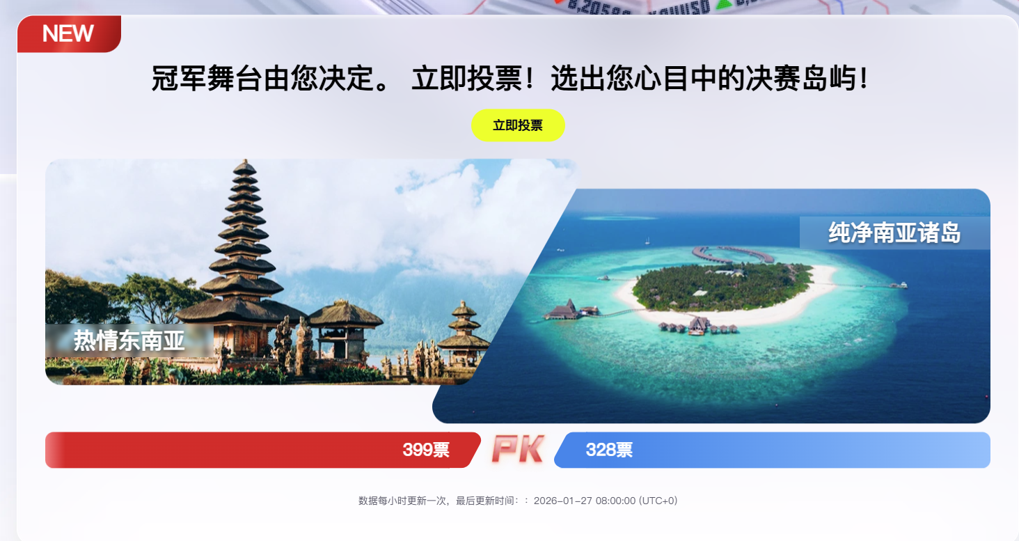 目前的实时投票结果显示,东南亚度假胜地以 2064 票领先,而热情东南亚则以 1392 票紧随其后。投票数据每小时更新一次,每一票都或将改写决赛舞台目的地!