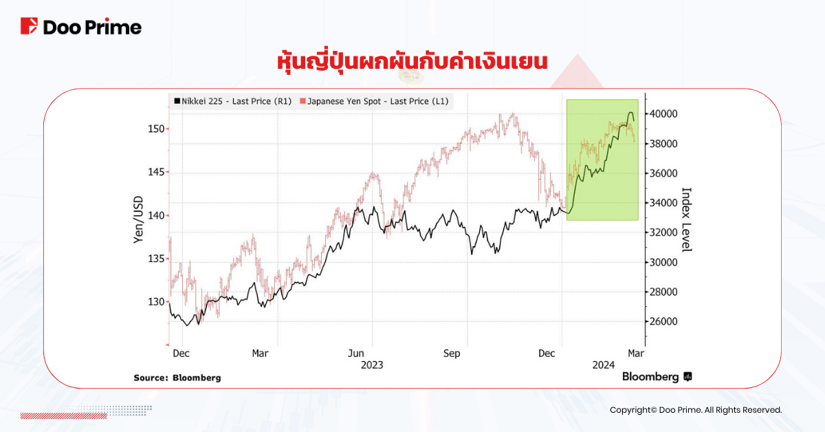 ความสัมพันธ์แบบผกผันระหว่างดัชนี Nikkei และเงินเยนแสดงให้เห็นว่าตลาดหุ้นที่แข็งแกร่งมักจะมาพร้อมกับค่าเงินเยนที่อ่อนค่าลง