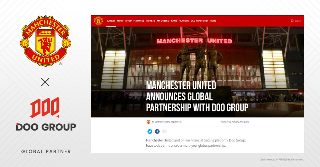 “Glory, glory Man United!” ร้อง เชียร์ และชื่นชมที่แมนเชสเตอร์ยูไนเต็ดหรือแมนยูได้เป็นพาร์ทเนอร์อย่างเป็นทางการกับ Doo Group เจ้าพ่อด้านฟินเทค ในฐานะที่เราเป็นแพลตฟอร์มการลงทุนทางการเงินที่ได้เป็นพาร์ทเนอร์อย่างเป็นทางการของแมนยู การเป็นพาร์ทเนอร์ครั้งนี้แสดงให้เห็นถึงก้าวแรกแห่งความสำเร็จครั้งสำคัญของ Doo Group ในการเป็นบริษัทระดับโลกไปพร้อมกับสโมสรฟุตบอลชั้นนำ เป็นเกียรติอย่างยิ่งที่ Doo Group จะได้ยืนคู่กับสโมรสรฟุตบอลที่ใหญ่ที่สุดในโลก