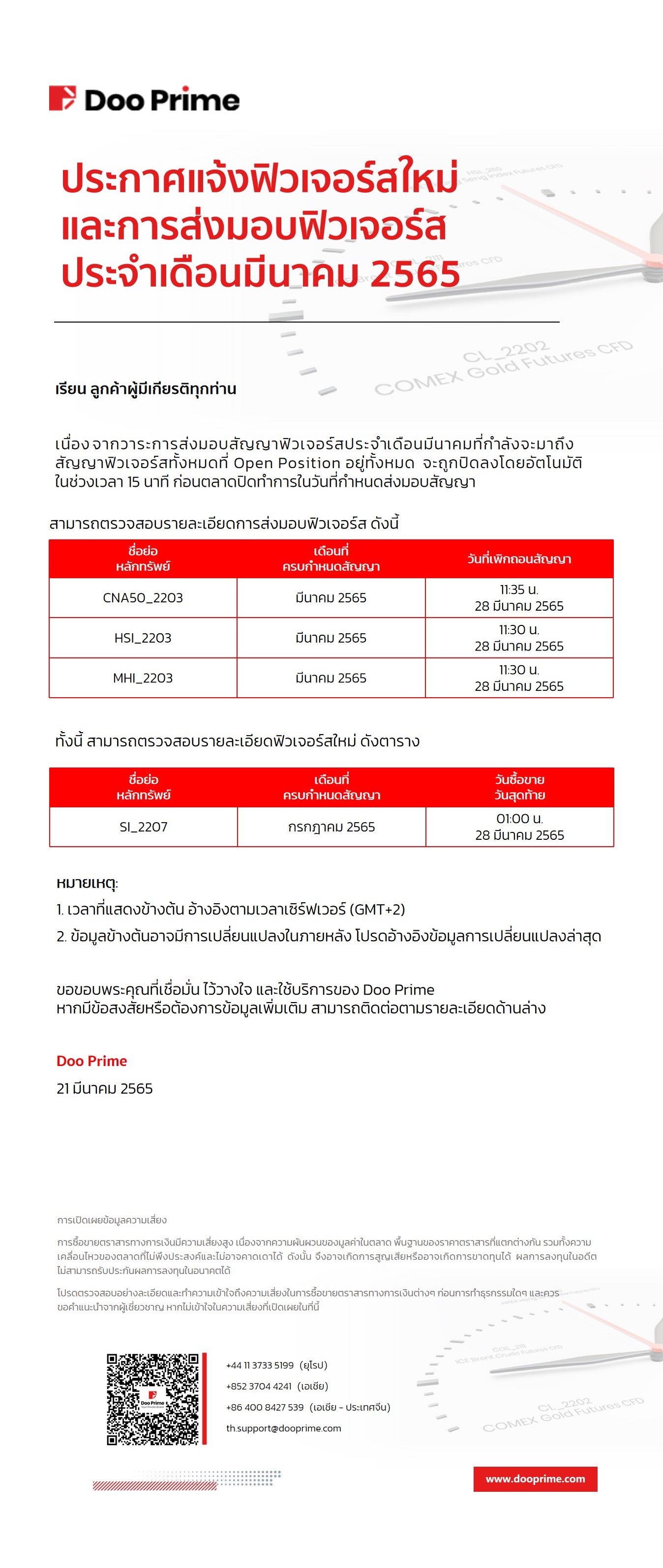 Doo Prime ประกาศแจ้งฟิวเจอร์สใหม่และการส่งมอบฟิวเจอร์สประจำเดือนมีนาคม 2565