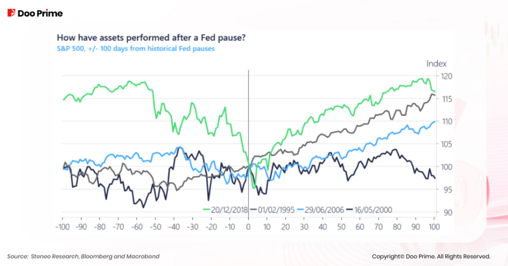 โดยปกติแล้ว หุ้นสหรัฐมักจะปรับตัวขึ้นในช่วงที่หยุดการปรับขึ้นอัตราดอกเบี้ยชั่วคราว แต่มักจะเกิดความปั่นป่วนอย่างมากเมื่อเกิดการปรับขึ้นอัตราดอกเบี้ยอีกครั้ง การตัดสินใจของเฟดในการหยุดการขึ้นดอกเบี้ยนั้นทำให้นักลงทุนอยู่ในภาวะที่กลืนไม่เข้าคายไม่ออก โดยนักลงทุนจำเป็นต้องวางกลยุทธ์เพื่อทำกำไรจากหุ้นสหรัฐ และในขณะเดียวกันก็ต้องป้องกันตัวเองจากการดึงกลับ (Pullback) ของราคาด้วย