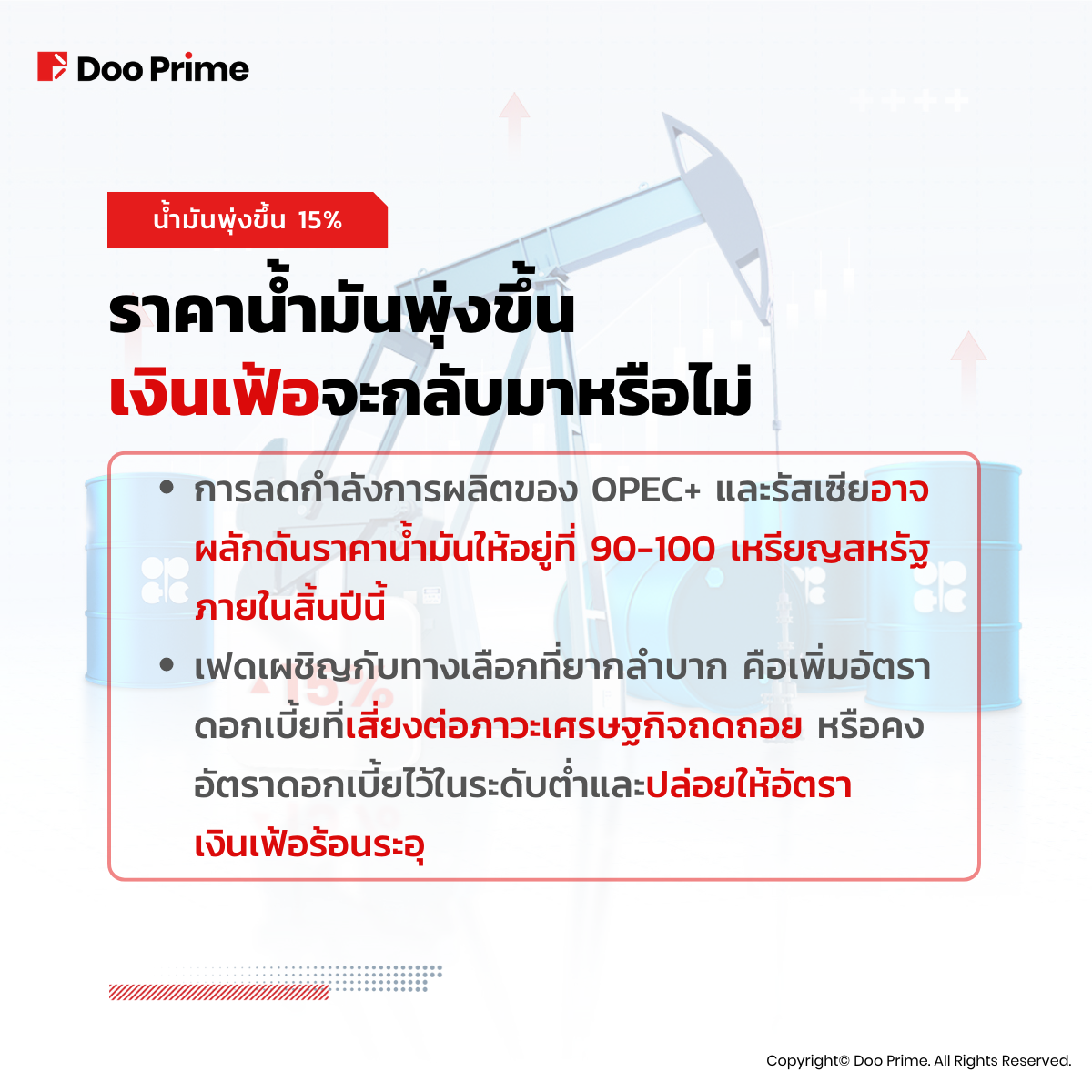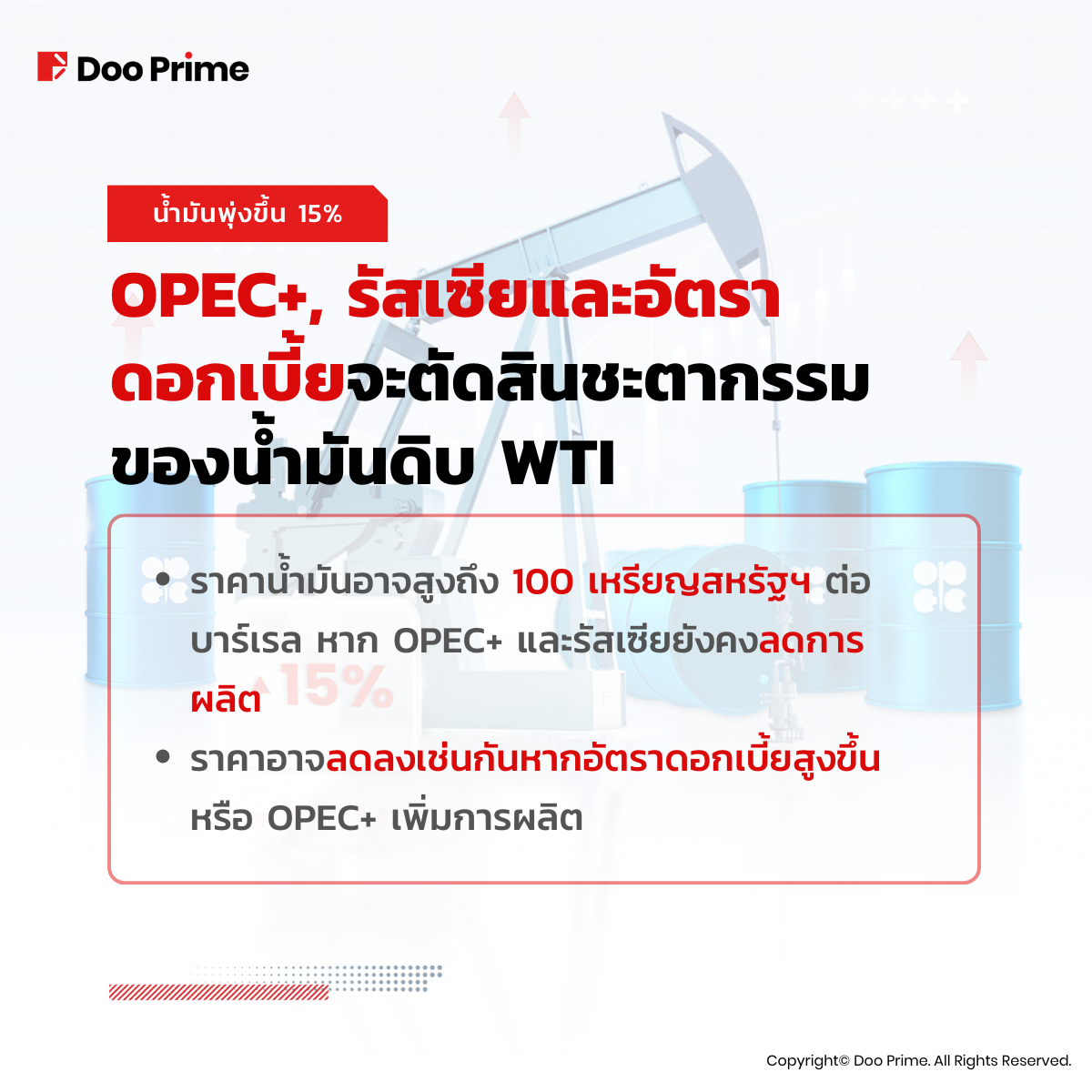 • อย่างไรก็ตาม ราคาน้ำมันอาจลดลงเช่นกันหากอัตราดอกเบี้ยที่สูงขึ้นขัดขวางการเติบโตของเศรษฐกิจโลก หรือหาก OPEC+ ตัดสินใจเพิ่มการผลิตน้ำมัน
