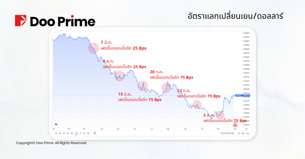 ธนาคารกลางสหรัฐฯ ตัดสินใจขึ้นอัตราดอกเบี้ย 25 Bps ในเดือนมีนาคม 2022 เพื่อควบคุมระดับเงินเฟ้อที่สูงในสหรัฐฯ และปรับขึ้นอีก 50 Bps ในเดือนพฤษภาคม และหลังจากนั้น FED ได้ขึ้นอัตราดอกเบี้ยครั้งใหญ่ 75 Bps และคงอัตราดอกเบี้ยพื้นฐานเชิงรุก 75 Bps มาตลอด