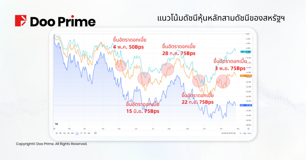 นับตั้งแต่ที่ธนาคารกลางสหรัฐฯ เริ่มปรับขึ้นอัตราดอกเบี้ยอย่างรุนแรง หุ้นสหรัฐฯ ก็เข้าสู่ช่วงตลาดหมีไปพร้อมๆ กัน จนถึงปีนี้ ดัชนีหุ้นหลักทั้งสามของสหรัฐฯ ร่วงลงมาตลอด ซึ่งในขณะที่เขียนบทความนี้ Dow Jones, S&P 500 และ Nasdaq ต่างร่วงลงไป 9.36%, 20.19% และ 33.01% ตามลำดับในปีนี้