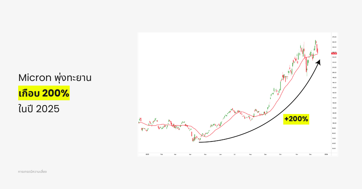 Micron (MU) พุ่งขึ้นราว 200% จากจุดต่ำสุดในปี 2025 ถือเป็นหนึ่งในหุ้นที่ทำผลงานได้ดีที่สุดในปีนั้น